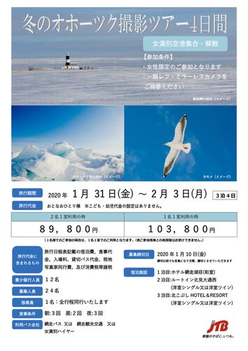 今日は冬の青空が広がり良い天気になった北見地方です。最高気温は6度と寒い一日に なりそうですが、道路に積もった雪は溶けそうですね。さて、今週のブログは2020年に 開催する撮影ツアーのご案内です。1月31日から2月3日までの3泊4日で冬のオホーツク 絶…